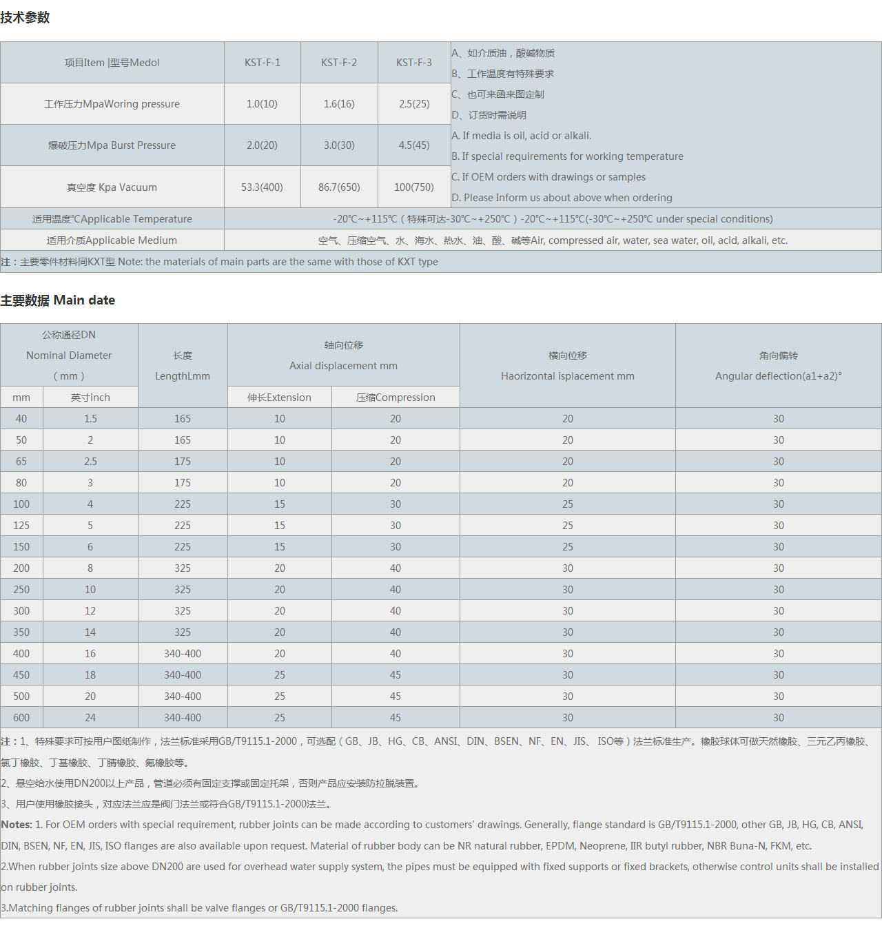 | 注:1、特殊要求可按用戶圖紙制作,可選配(GB、JB、HG、CB、ANSI、DIN、BSEN、NF、EN、JIS、 等)法蘭標(biāo)準(zhǔn)生產(chǎn)。橡膠球體可做天然橡膠、三元乙丙橡膠、氯丁橡膠、丁基橡膠、丁腈橡膠、氟橡膠等。 2、懸空給水使用DN200以上產(chǎn)品,管道必須有固定支撐或固定托架,否則產(chǎn)品應(yīng)安裝防拉脫裝置。 3、用戶使用橡膠接頭,對(duì)應(yīng)法蘭應(yīng)是閥門法蘭。 Notes: 1. For OEM orders with special requirement, rubber joints can be made according to customers' drawings. Generally, flange standard is , other GB, JB, HG, CB, ANSI, DIN, BSEN, NF, EN, JIS, flanges are also available upon request. Material of rubber body can be NR natural rubber, EPDM, Neoprene, IIR butyl rubber, NBR Buna-N, FKM, etc. 2.When rubber joints size above DN200 are used for overhead water supply system, the pipes must be equipped with fixed supports or fixed brackets, otherwise control units shall be installed on rubber joints. 3.Matching flanges of rubber joints shall be valve flanges or flanges. |